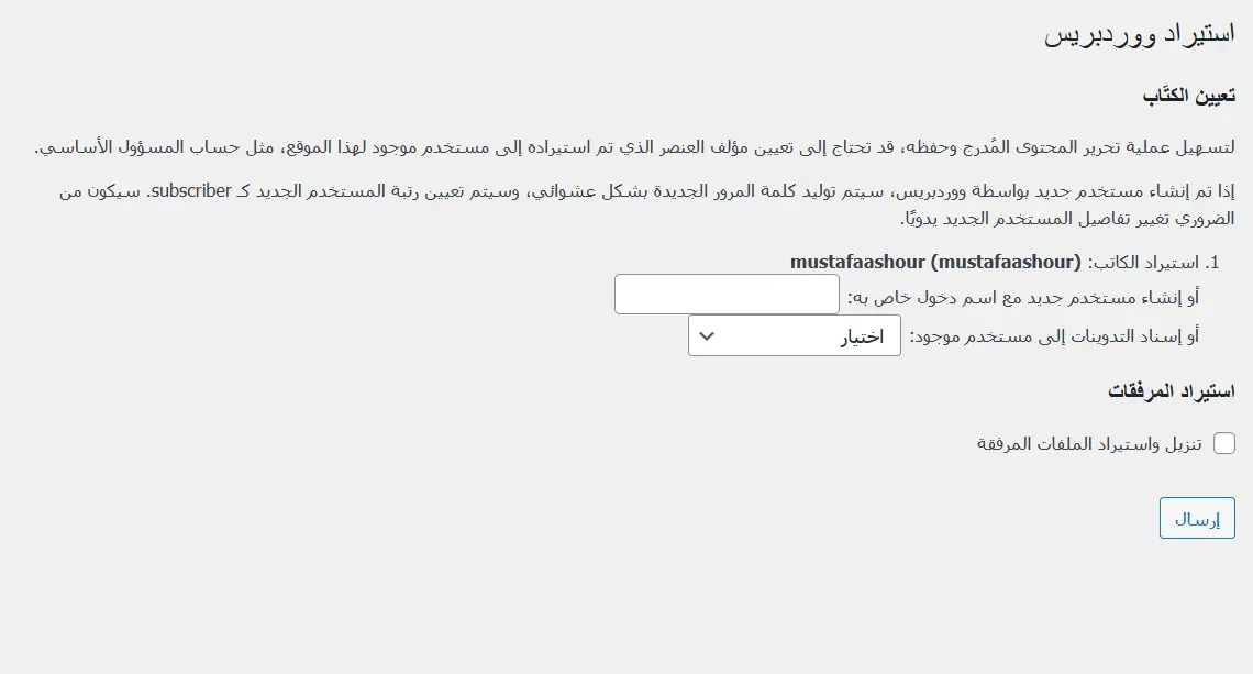 وهنا يسألك النظام عمّا إذا كنت تريد أن يتم إنشاء عضوية جديدة باسم المستخدم القديم المسجّل في WordPress.org أو إنشاء عضوية جديدة باسم من اختيارك، أو أن تُسند المحتويات القديمة بالكامل لعضو معين ضمن موقعك، وفي هذه الحالة يمكنك اختيار الخِيار الثالث ومن ثم اختر عضويتك أنت. ولا تنسى أن توافق على خِيار (تنزيل واستيراد الملفات المرفقة) لكي يتم استيراد الصور والمحتويات الأخرى.