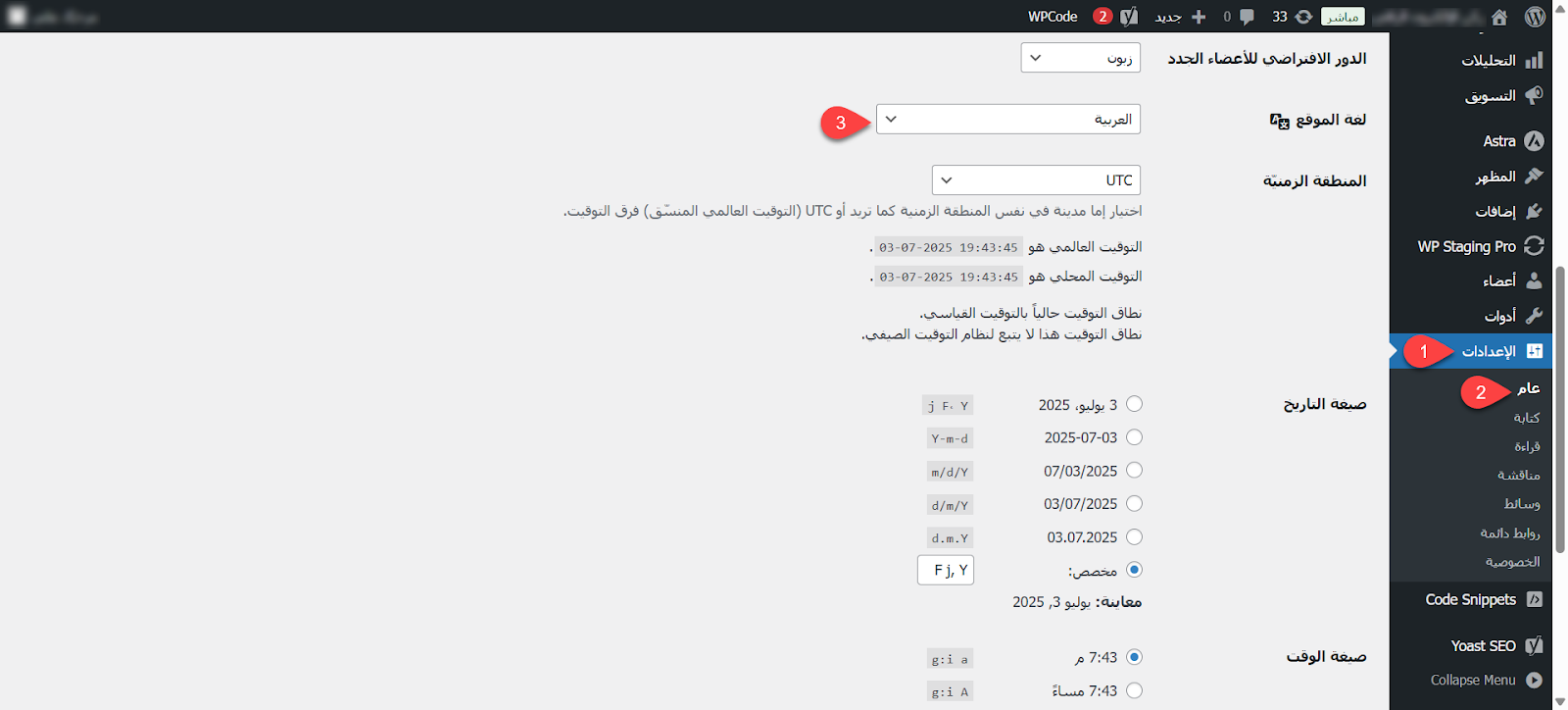 هناك العديد من الطرق الفعالة التي اعتمدت عليها لحل هذه المشكلة، ففي البداية تأكدت من أن لغة الموقع هي العربية من خلال التوجه إلى (الإعدادات) ثم (عام)، وعندما كانت كذلك واستمرت المشكلة بالظهور أدركت أن القالب المختار لا يدعم الاتجاه من اليمين إلى اليسار RTL، ولذلك لحل هذه المشكلة قمت باستبدال قالب الموقع بآخر يدعم اللغة العربية بشكل افتراضي.