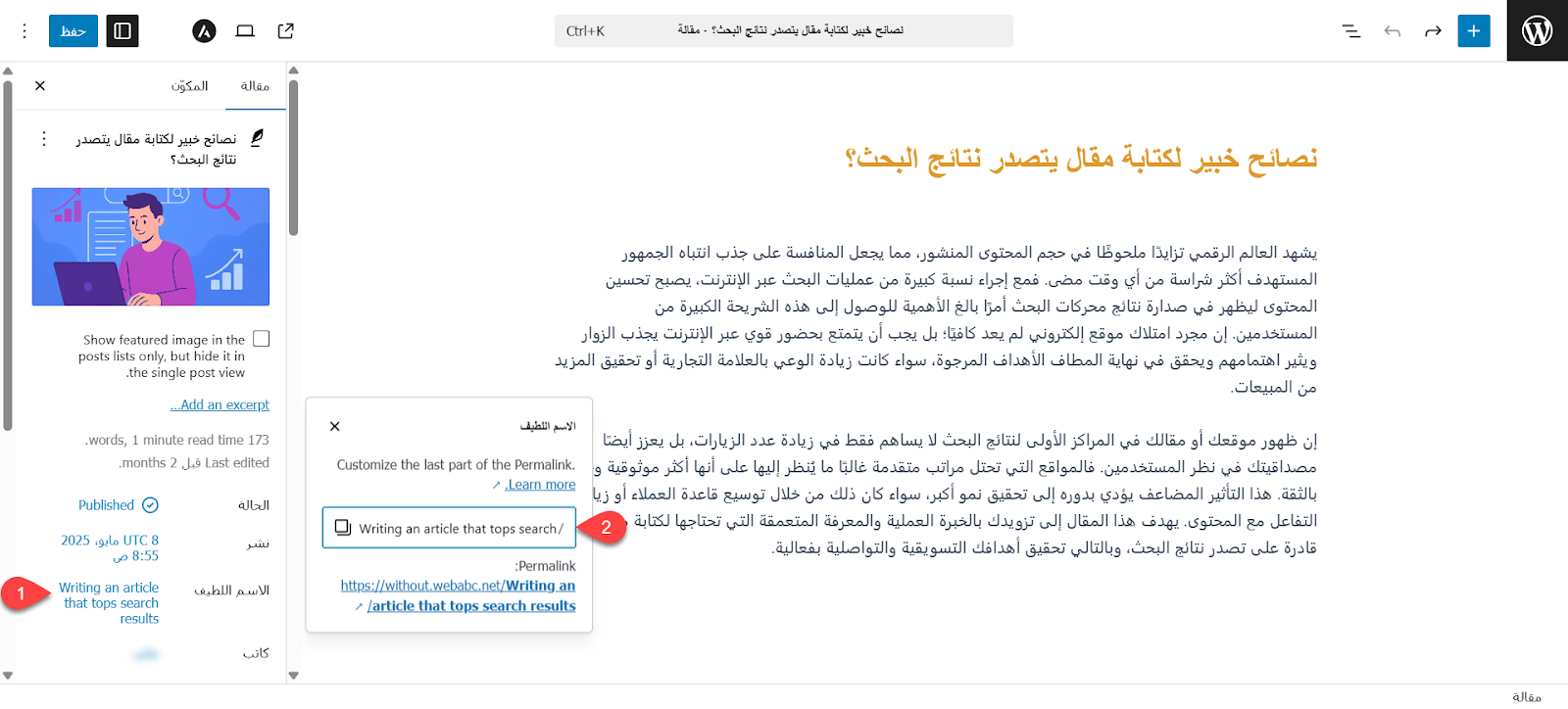 للتغلب على هذه المشكلة كنت أحدد تنسيق الرابط الدائم في إعدادات ووردبريس ليتضمن اسم المقالة، وبعد ذلك من أجل حل مشكلة اللغة العربية في الروابط كنت أعتمد على روابط قصيرة باللغة الإنجليزية (Slug)، حيث أحدد رابط الصفحة أو المقالة يدويًا عند إنشائها، فبدلًا من ترك ووردبريس يولدها تلقائيًا، أحدد الرابط الذي أريدها من خلال إضافته في خيار (الاسم اللطيف) أو (Slug) الموجود في القائمة الجانبية من محرر جوتنبرج.
