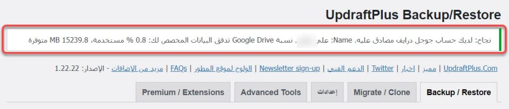 الآن ستتم مباشرة إعادة توجيهك إلى صفحة إدارة النسخ الاحتياطي على موقعك، وإعلامك بنجاح عملية المصادقة مع جوجل من خلال عرض إشعار نجاح عملية الربط مع جوجل درايف في أعلى الصفحة كما يلي.
