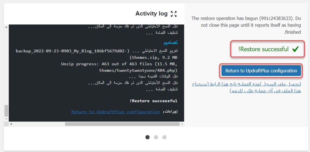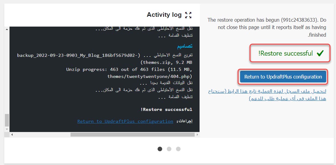 سيظهر لك بعد نجاح عملية الاستعادة عبارة (Restore successful)، وسيكون بإمكانك العودة إلى صفحة إدارة النسخ الاحتياطي لموقعك الإلكتروني عبر النقر على زر (Return to Updraftplus configuration).