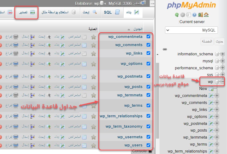 في تلك الصفحة، انقر على قاعدة بيانات موقع الووردبريس التي تريد إنشاء نسخة احتياطية منها (ليس بالضرورة أن يكون اسم قاعدة البيانات لديك كما في الصورة)، ثم قم بتحديد جميع الجداول الموجودة في قاعدة البيانات، وانقر على زر (تصدير).