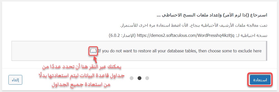 سيتم خلال لحظات تجهيز ملفات النسخة الاحتياطية من أجل استعادتها، ثم ستطالبك الإضافة بالنقر على زر (استعادة) مرة أخرى لتأكيد الاستمرار في عملية الاستعادة، وذلك لأن البيانات التي سيتم استعادتها سوف تستبدل بالبيانات الموجودة في الموقع حاليًا.