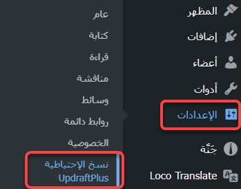بعد تنصيب وتفعيل الإضافة في موقعك، ستجد خيارًا جديدًا باسم (النسخ الاحتياطية UpdraftPlus) عند النقر فوق التبويب (إعدادات) في لوحة تحكم موقعك، عند النقر فوق هذا الخيار سيتم عرض صفحة إدارة النسخ الاحتياطي