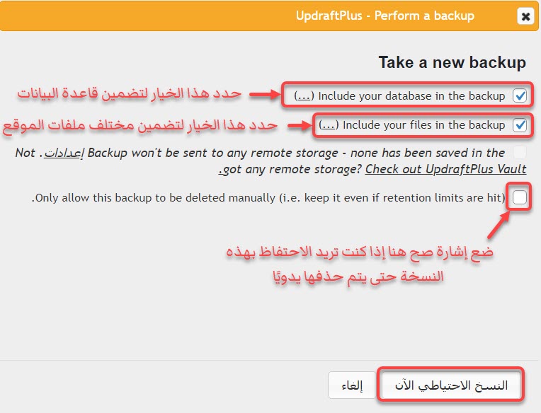 في حالة عدم اختيار إنشاء اتصال بين إضافة UpdraftPlus في موقعك الووردبريس وخدمة تخزين سحابي لديك حساب فيها مثل جوجل درايف، فإن جميع النسخ الاحتياطية التي سيتم إنشاؤها ستخزن في استضافتك فقط، وفي حال تعرض موقعك للاختراق، فيحتمل أن تتعطل تلك النسخ الاحتياطية كذلك.