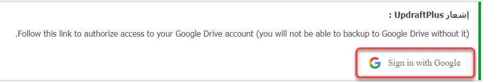 انقر على زر (حفظ التغييرات) الموجود أسفل الصفحة، وبعد أن تتم عملية الحفظ، انتقل إلى أعلى الصفحة. ستلاحظ وجود إشعار متعلق بالربط مع جوجل درايف وضمنه زر (Sign in with Google) عليك النقر عليه لمتابعة عملية المصادقة.