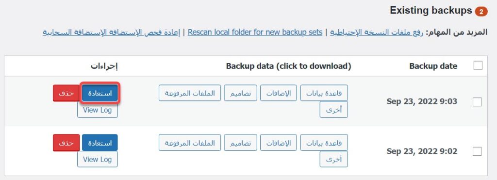 من أجل استعادة إحدى النسخ الاحتياطية لموقع الووردبريس الخاص بك، عليك أن تنقر على زر (استعادة) الخاص بالنسخة الاحتياطية التي تريد استعادتها في قسم النسخ الاحتياطية الموجودة ضمن تبويب (Backup / Restore) في صفحة إدارة النسخ الاحتياطي.