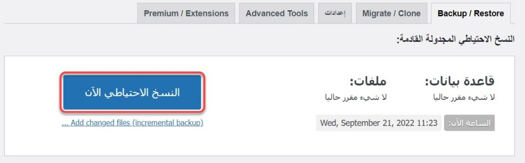 بعد ضبط الخيارات حسب رغبتك، عليك النقر على زر (النسخ الاحتياطي الآن) في الأسفل لبدء عمل نسخة احتياطية.