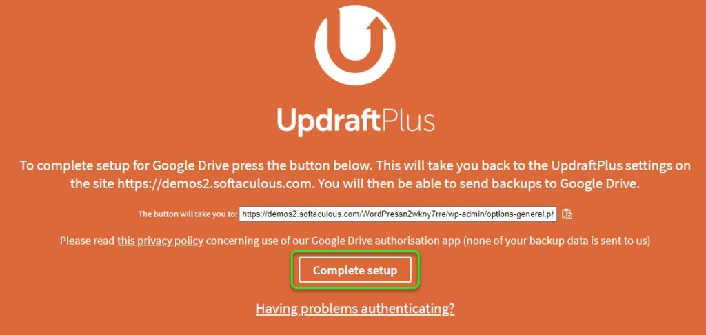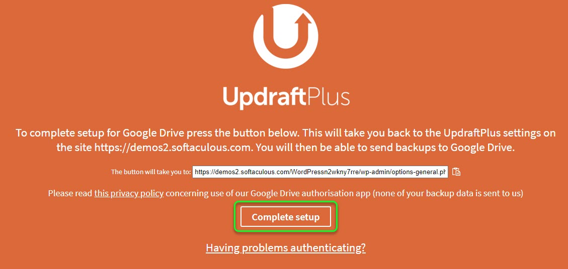 تختلف طريقة الربط بين الإضافة وخدمة التخزين السحابي اعتمادًا على تلك الخدمة، لكن الإضافة سترشدك بشكل دقيق إلى كيفية فعل ذلك، وبما أن جوجل درايف واحدة من خدمات التخزين السحابي الشائعة، فسنشرح هنا كيفية الربط معها لتخزين النسخ الاحتياطية للموقع فيها.