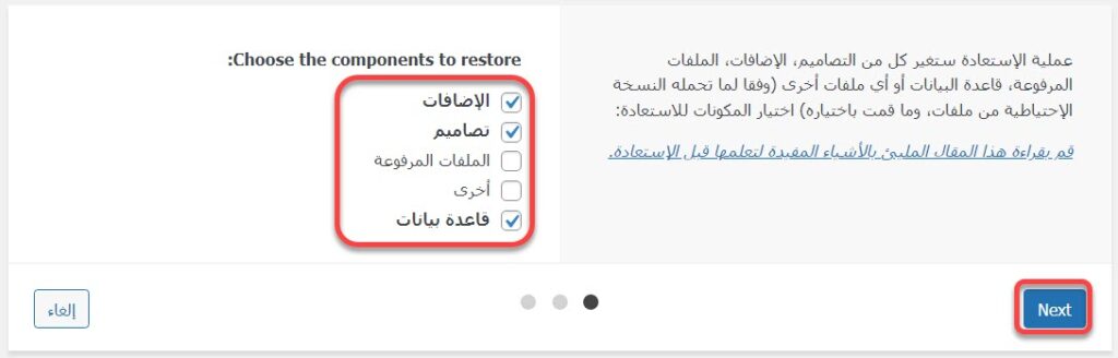 ستظهر لك نافذة تطلب منك تحديد البيانات التي تريد أن تستعيدها، مثل بيانات قاعدة البيانات، وملفات القوالب، وملفات الإضافات، وغيرها. عليك أن تحدد البيانات التي تريد استعادتها من النسخة إلى الموقع، ثم تنقر على زر المتابعة (Next).