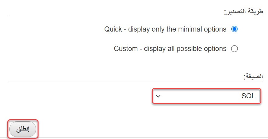 ستظهر لك خلال لحظات نافذة تطلب منك تحديد بعض الخيارات. تأكد من أنه سيتم تصدير قاعدة البيانات بصيغة SQL، ثم انقر على زر (انطلق).