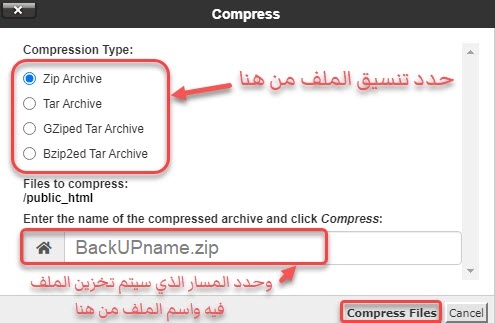 ستظهر لك بعدها نافذة تطلب منك اختيار تنسيق الملف المضغوط، وتحديد المسار الذي سيتم تخزين الملف داخله. قم باختيار تنسيق ZIP أو RAR أو أي تنسيق آخر تريده، وحدد المكان الذي تريد أن يتم وضع الملف المضغوط فيه (الذي سيمثل النسخة الاحتياطية لملفات الموقع)، ثم انقر على زر (Compress Files).