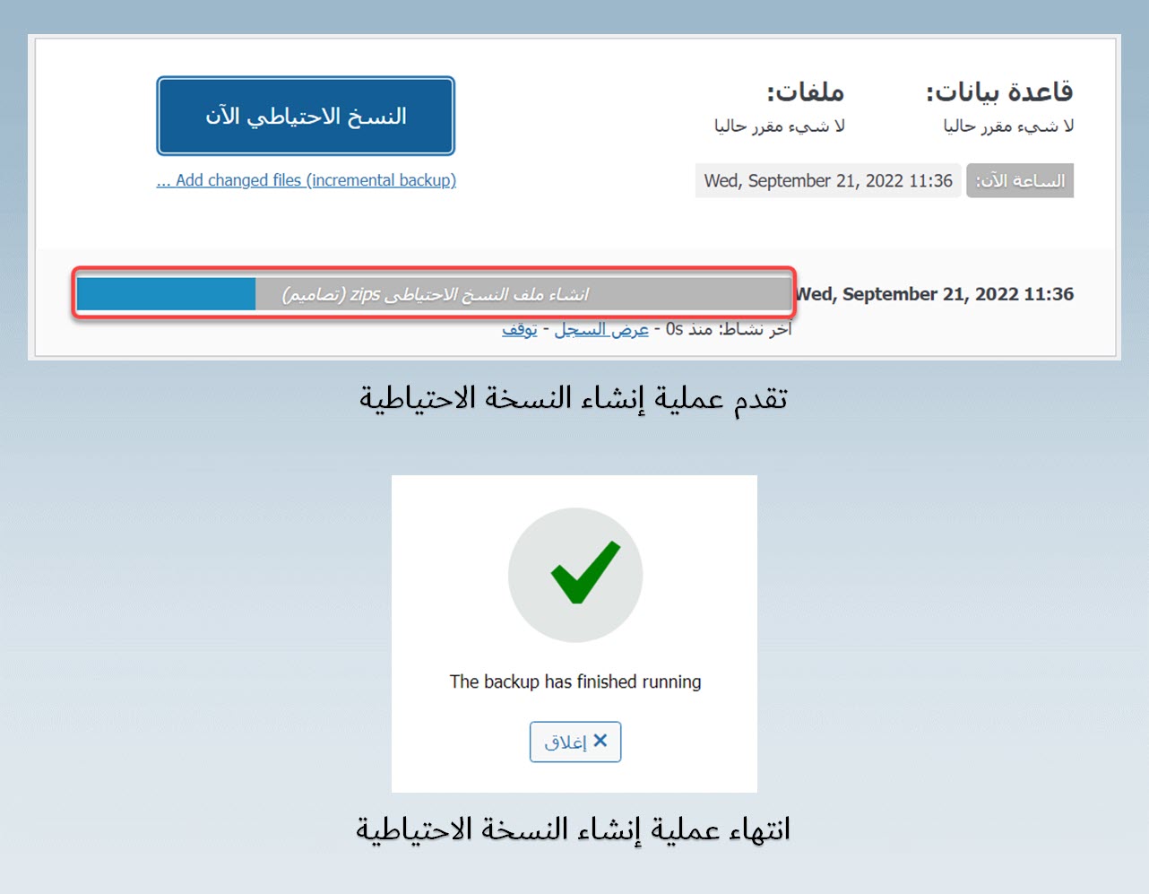 سيتم مباشرة بدء عملية إنشاء نسخة احتياطية من موقعك الإلكتروني، وسيكون بإمكانك رؤية تقدم العملية أسفل زر (النسخ الاحتياطي الآن)، كما سيتم إعلامك عندما تنتهي الإضافة من عمل النسخة الاحتياطية للموقع عن طريق إظهار نافذة منبثقة أو إشعار يعرض إشارة صح ورسالة The backup has finished running كما يلي.