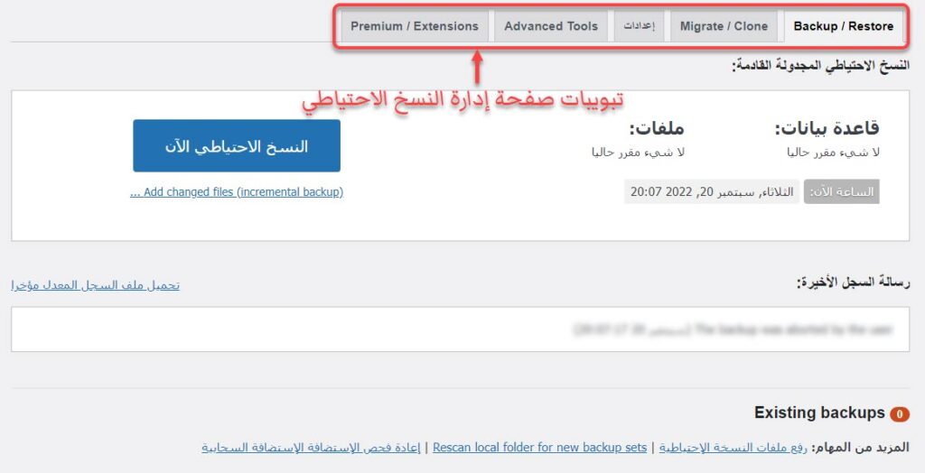 تحتوي صفحة إدارة النسخ الاحتياطي العديد من التبويبات التي تتضمن خيارات كثيرة توفر إمكانية القيام بوظائف عديدة متعلقة بعمل واستعادة نسخة احتياطية لموقع الووردبريس، وسنشرح في الفقرات التالية أهم الإجراءات التي يجب معرفتها.