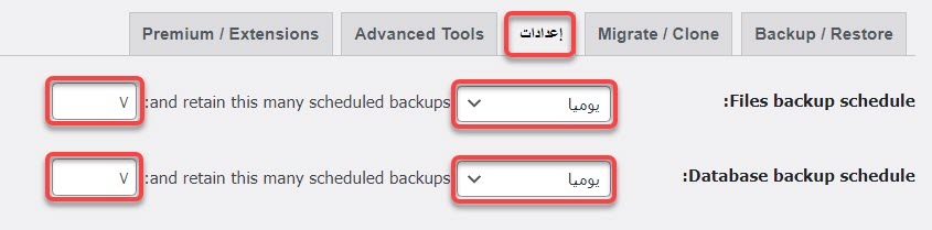 للقيام بذلك حدد من القائمتين المنسدلتين الموجودتين بجانب عبارتي (Files backup schedule) و (Database backup schedule) في تبويب (إعدادات) كل كم من الوقت تود أن تقوم الإضافة بإنشاء نسخة احتياطية للموقع، ثم حدد عدد النسخ الاحتياطية التي سيتم الاحتفاظ بها عن طريق إدخال رقم في مربع النص الموجود في نفس السطر.