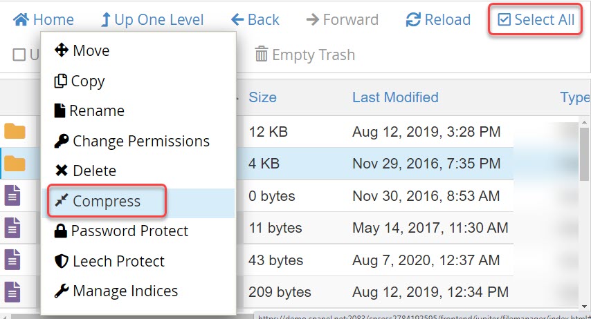 لضغط محتويات المجلد، ادخل إليه، ثم قم بتحديد جميع محتوياته عبر النقر على (Select All)، ثم انقر بزر الفأرة الأيمن على أحدها، ثم اختر الأمر (Compress) من القائمة الظاهرة.