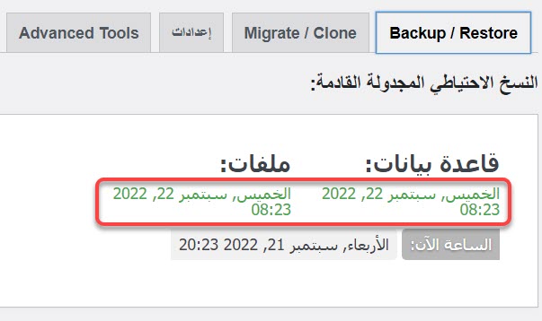 بعد تحديد كل كم من الوقت سيتم إنشاء نسخة احتياطية من ملفات موقع الويب وقاعدة بيانات الموقع وعدد النسخ التي سيتم الاحتفاظ بها، يجب ألا تنسى النقر على زر (حفظ التغييرات) الموجودة أسفل الصفحة والتأكد من أنه تمت جدولة النسخ الاحتياطي عن طريق الرجوع إلى تبويب (Backup / Restore) ومعرفة موعد النسخ الاحتياطي المقرر التالي.
