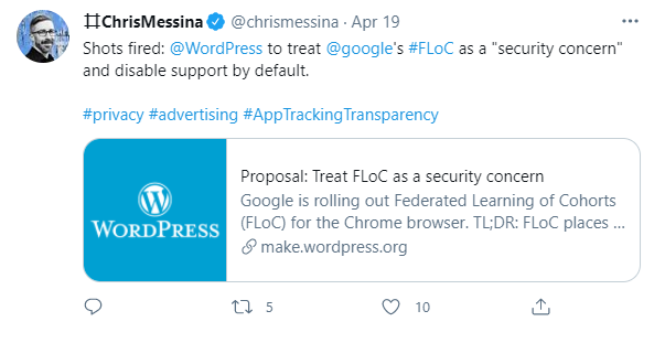 يبدو أن مطوري WordPress لا يحبذون اقتحام الخصوصية أيضًا، كما أنهم لم يقتنعوا بهذا الكم من الإيجابيات المذكور آنفًا، فقد قرروا مناقشة اقتراح يقضي بحظر FLoC من نظامهم والمواقع التي تستخدمه.