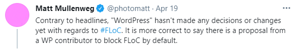 كما أن هذه النقاشات من شأنها أن تحلّ مُعضلةً أُخرى، وهي كون WordPress حياديًا في تعامله مع الأنظمة التي تستخدم "ملفات تعريف الارتباط"، وإذا قرروا حظر FLoC، فإن ذلك يعني أنهم تركوا ذلك الحياد، واصطفوا في صف المُعارضين لهم.