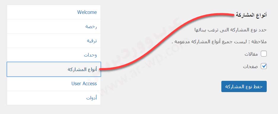 وفي حالة أردت أنت تفعيل الإضافة على المقالات، فيجب أولا وضع علامة صح في خانة المقالات ثم حفظ الإعدادات لنوع المشاركة.