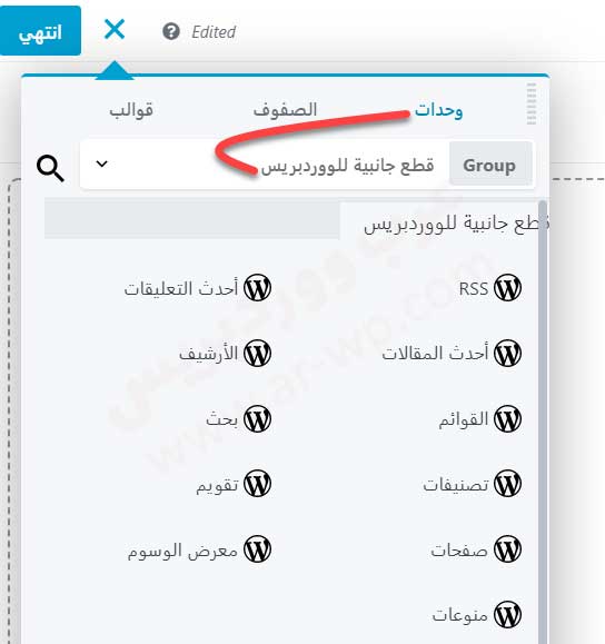 بينما في قطع جانبية للوردبريس ستجد مجموعة من الودجات الافتراضية مع الووردبريس وهي كما ترى بالصورة.
