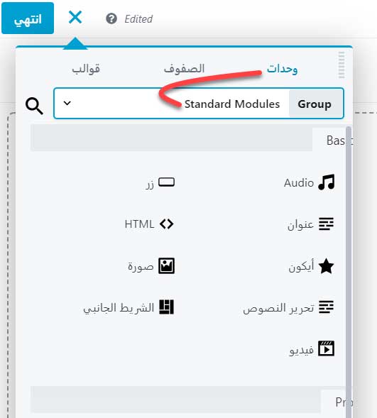 من الوحدات ستجد قائمة منسدلة يمكنك اختيار بين الـ Standard Moduls والتي منها تجد الوحدات التي كنا تكلمنا عنها في إعدادات بيفر بيلدر. ومنها تجد في القائمة Basics الـ 9 وحدات الأساسية المجانية وهم (ملف صوتي Audio – زر – عنوان – HTML لإدراج الأكواد البرمجية – أيكون لإضافة الأيقونات – صورة – تحرير النصوص – فيديو – الشريط الجانبي).
