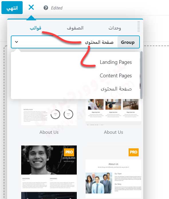 من تاب قوالب ستجد 3 اختيارات من القائمة المنسدلة وهم (صفحة المحتوى – landing pages – content pages) وفي كل اختيار منهم ستجد مجموعة مختلفة من القوالب الجاهزة التي يمكنك الاعتماد عليها في بناء صفحتك بشكل سريع.