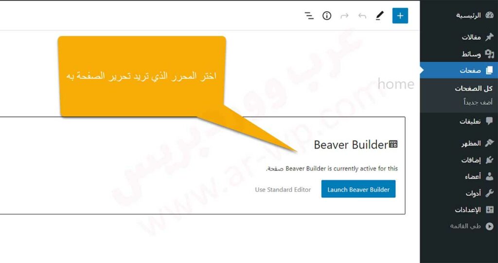 وبمجرد فتح الصفحة ستجد أن الموقع يخيرك بين استخدام beaver builder أو المحرر الافتراضي Standard Editor، علمًا أن المحرر الافتراضي إما أن يكون محرر المكونات Block Editor أو المحرر الكلاسيكي في حالة كنت تعتمده كمحرر افتراضي.