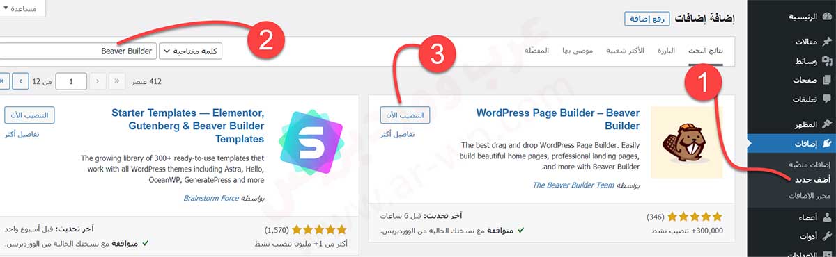 لتثبيت إضافة بيفر بيلدر المجانية توجه إلى قسم الإضافات واختر أضف جديد وأبحث عن beaver builder أو يمكنك البحث باستخدام الاسم الكامل WordPress Page Builder – Beaver Builder، ثم ثبت الإضافة وفعلها لديك.