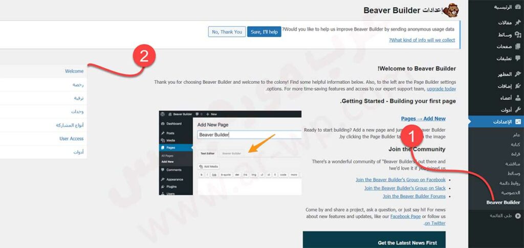 1 – 2 – إعدادات محرر الـ Beaver Builder Lite Version
