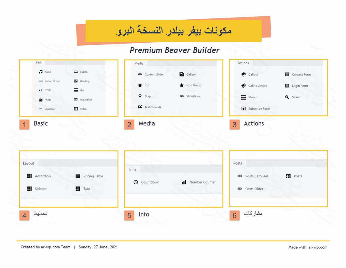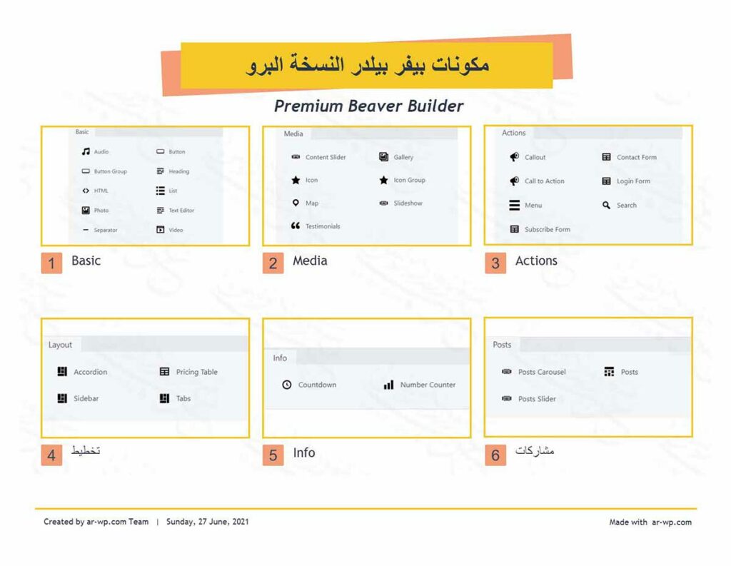 نبدأ حديثنا من مكونات بيفر بيلدر المكونة من 34 مكون نمطي في عدد 6 فئات، كما هو موضح في الصورة أعلاه وهي كالتالي: