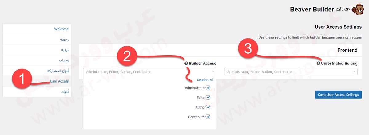 1 – 2 – 3 – User Access لتحديد من يمكنه استخدام beaver builder
