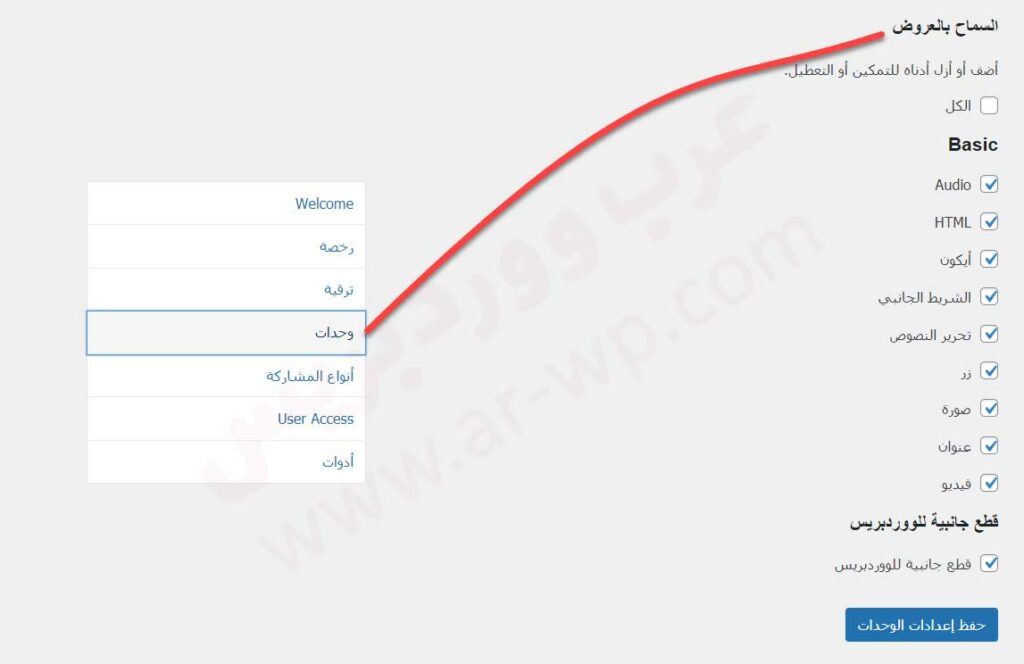 وبالطبع هذه الوحدات هي التي تظهر في المحرر؛ معنى هذا أنك لو أحببت إيقاف الوحدات التي لا تستخدمها عادة فيمكنك بكل بساطة الغاء علامة الصح من جانب الوحدة ثم حفظ الإعدادات.