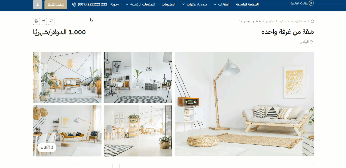 بعد ذلك، يمكنك إضافة تفاصيل أخرى مثل مستندات العقار ونموذج افتراضي بزاوية 360 درجة ومعلومات الاتصال أو التضمين لوكيل أو وكالة عقارية أو غير ذلك. وعند الانتهاء، قم بالضغط على "نشر" لنشر العقار على الموقع. وستجد العقار يظهر على الموقع بالمظر التالي: