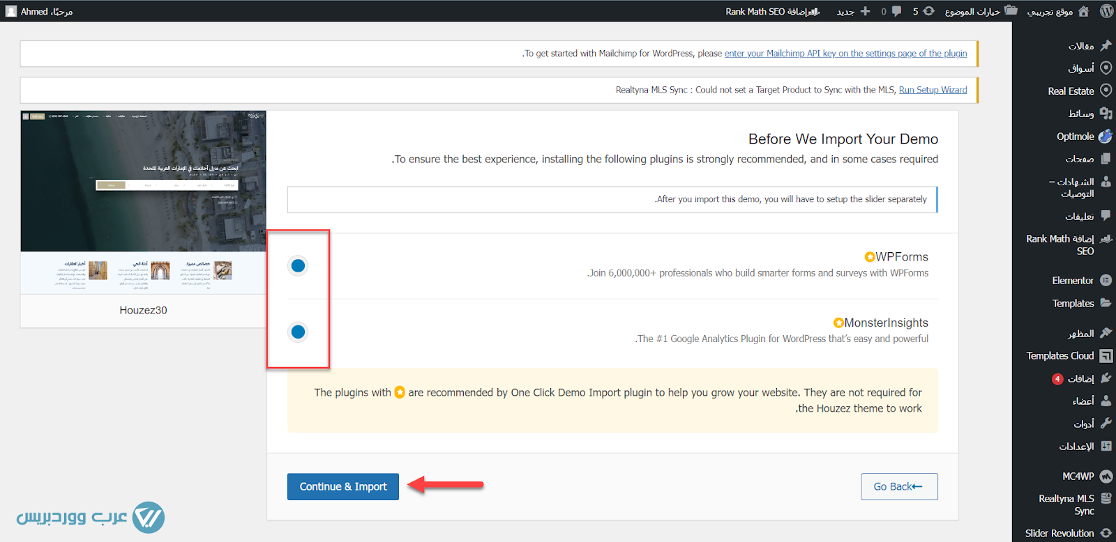 قد تتطلب بعض النماذج بعض الإضافات الإضافية لوظائف معينة. قم بتحديد تلك الإضافات المطلوبة ثم اضغط على "Continue and Import" لضمان الحصول على جميع ميزات النموذج بشكل كامل.
