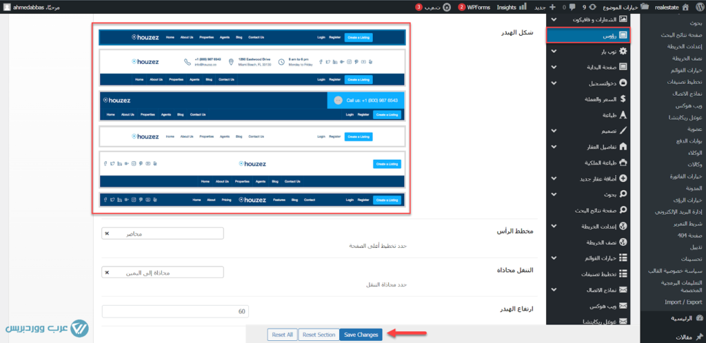 على سبيل المثال، يمكنك التحكم في طريقة عرض هيدر القالب من خلال اختيار "رؤوس" من القائمة الجانبية، ثم تحديد الهيدر المناسب وضبط الإعدادات الخاصة به من العناصر والأيقونات والعرض. بعد ذلك، قم بالضغط على "Save Changes" لحفظ التعديلات.
