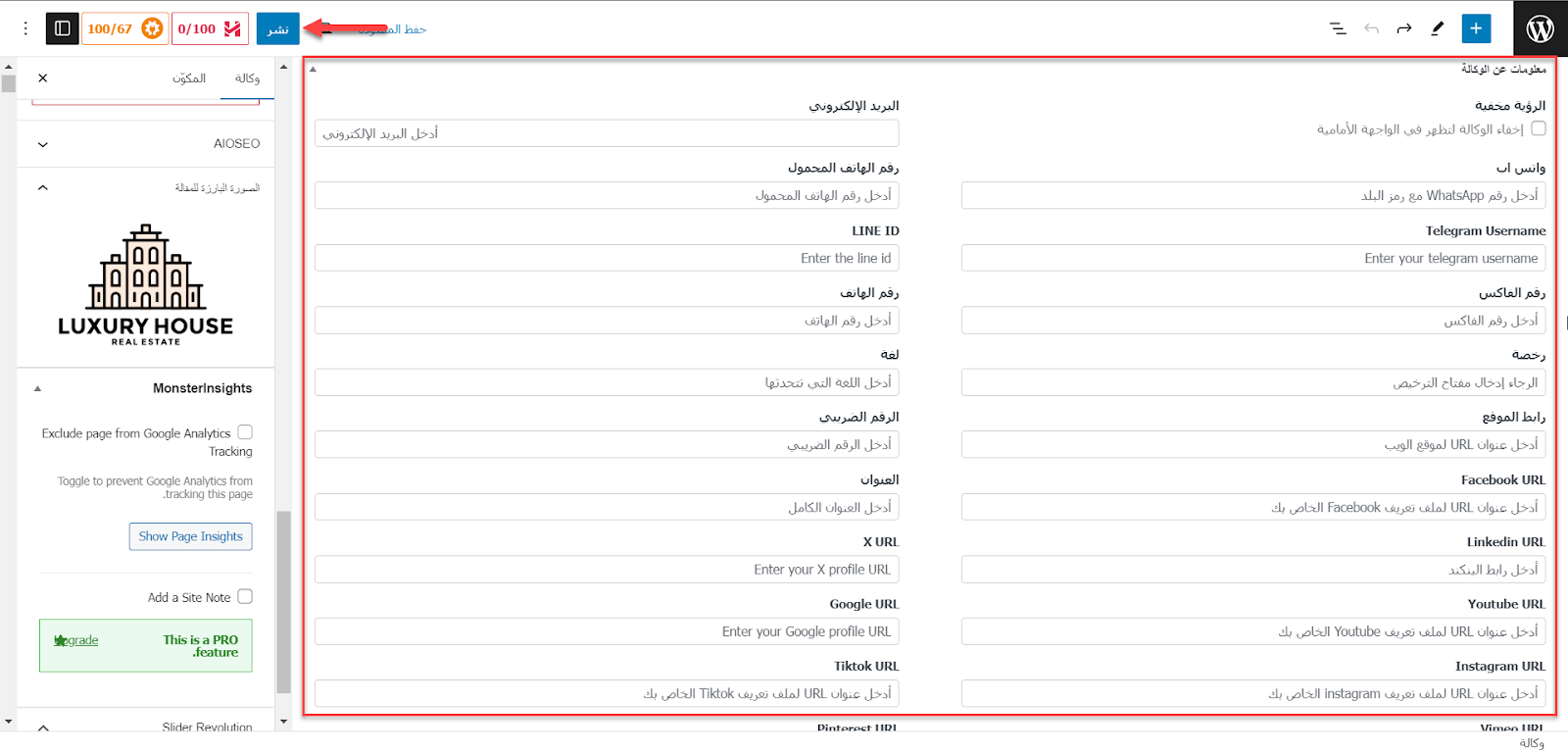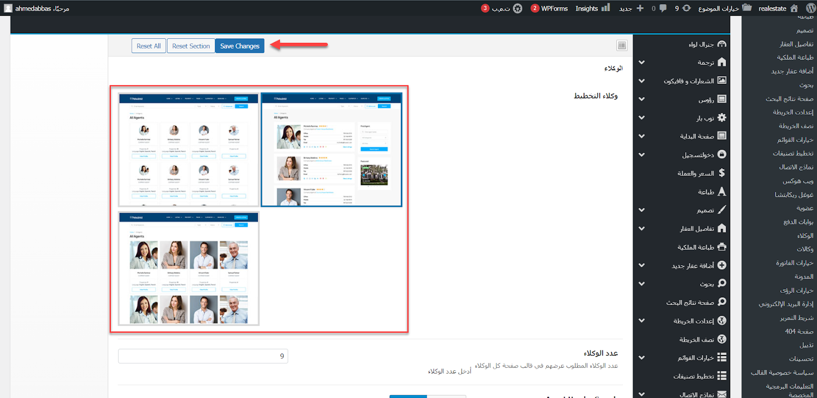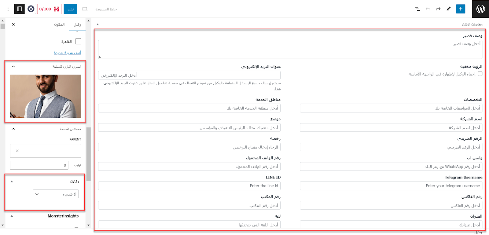 وبالإضافة إلى ذلك، يمكنك أيضًا تعديل تخطيط وطريقة عرض صفحة الوكلاء العقاريين والبيانات المسموح إضافتها في صفحتهم، مثل الرقم الهاتف أو حسابات التواصل الاجتماعي وغير ذلك، وذلك من خلال خيار "الوكلاء" في القائمة الجانبية.