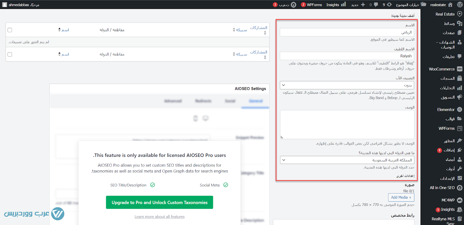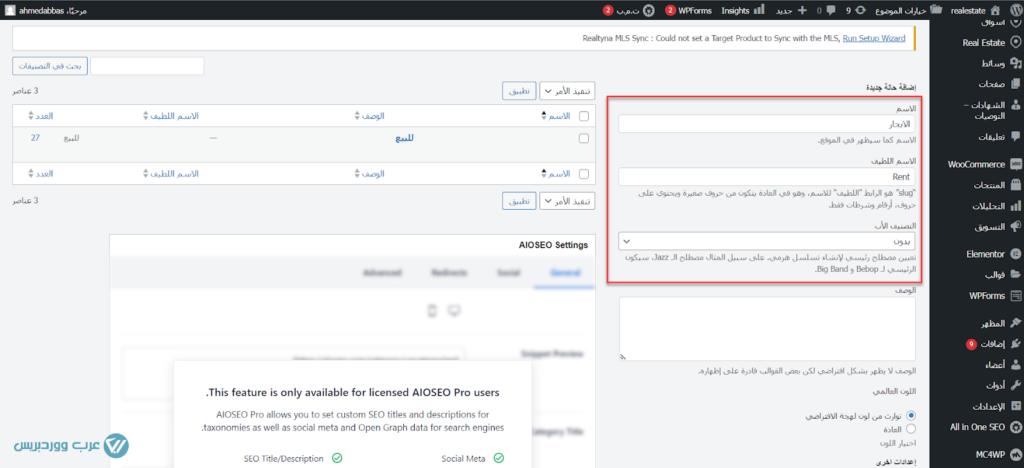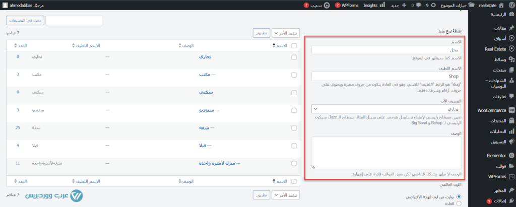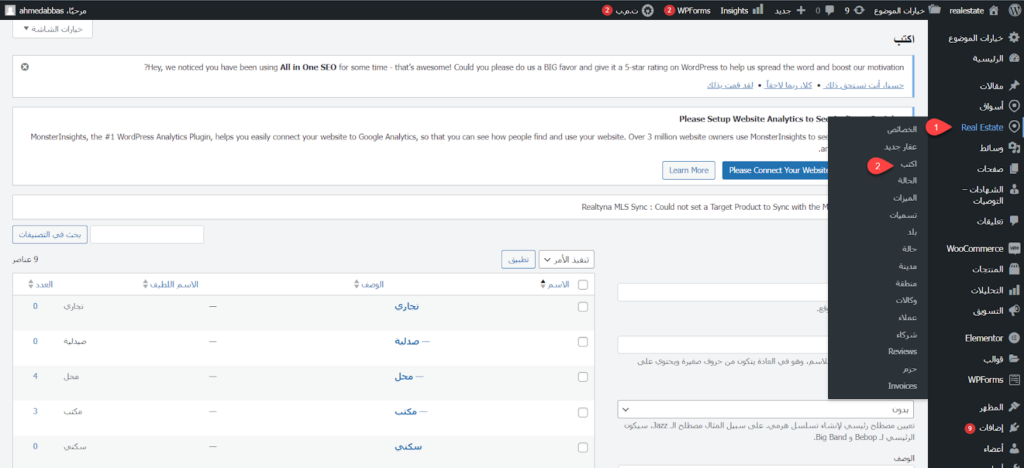 قم بالتوجه إلى قسم "Real Estate" في القائمة الجانبية لووردبريس للتحكم الكامل في تصنيفات وعقارات الموقع. ستجد معظم الخيارات في لوحة التحكم قد تم ترجمتها بشكل حرفي، وسنوضح لك كيفية استخدامها بشكل صحيح، بالإضافة إلى طريقة تعديل ترجمة القالب بأكملها بعد ذلك.