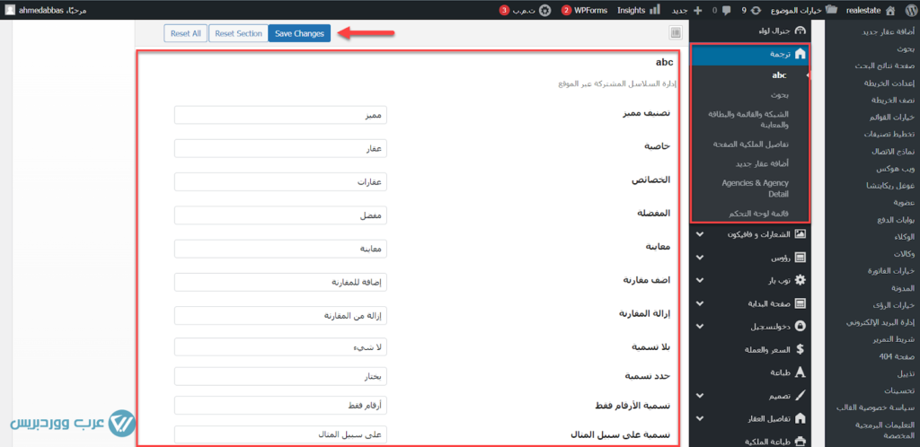 قد تواجه بعض المصطلحات الإنجليزية التي تم ترجمتها عربيًا بشكل غير مناسب أو غير مترجمة في القالب، سواء في لوحة تحكم كما واجهنا في الخطوات السابقة، أو في واجهة الموقع، أو صفحة العقارات، أو صفحة الوكلاء، أو صفحة البحث، أو غير ذلك.