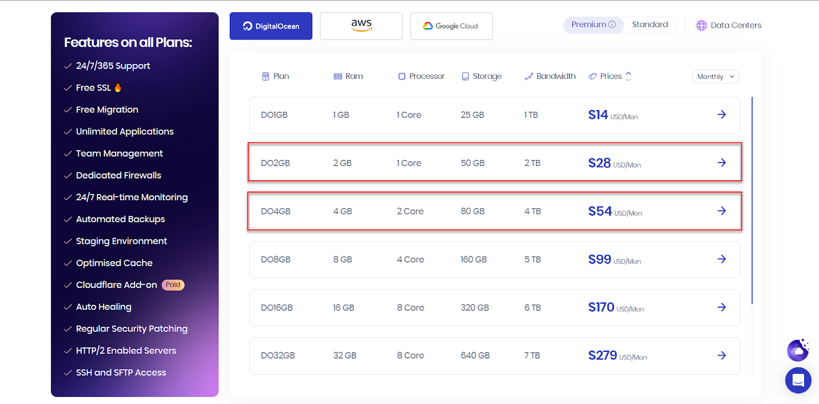 لذا، عند الاعتماد على استضافة Cloudways، يُمكنك الاعتماد على خطة D02GB كخيار أساسي، وفي حالة توافر الميزانية، يُفضل النظر في الترقية إلى خطة D04GB للحصول على أداء أفضل ومساحة تخزين إضافية.
