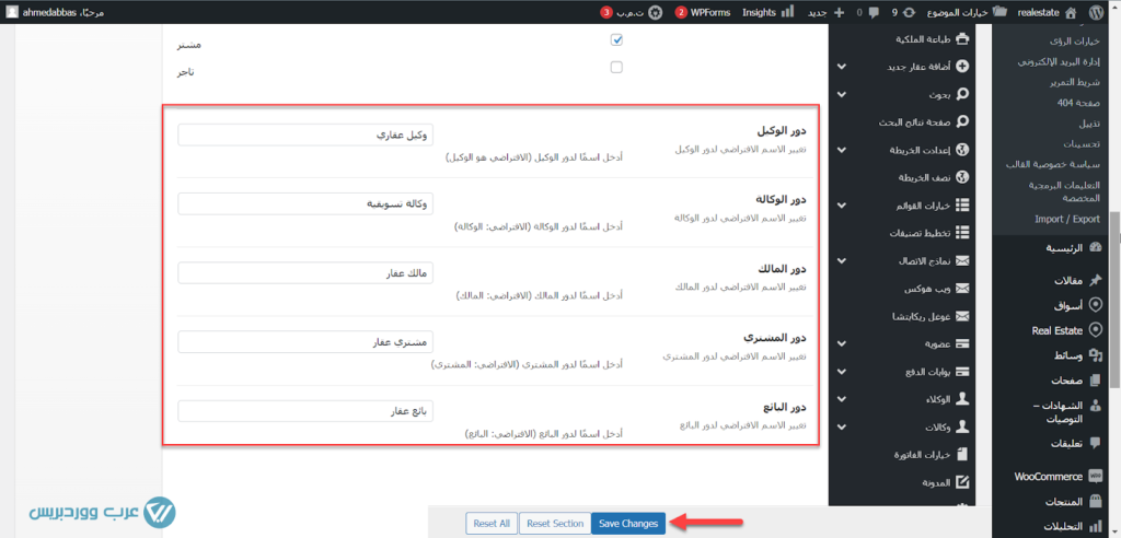 ويمكنك التحكم في أسماء أدوار المستخدمين عن طريق تحديد دور المستخدم وكتابة الترجمة المناسبة، ثم قم بحفظ التعديلات كما موضح في الصورة التالية:
