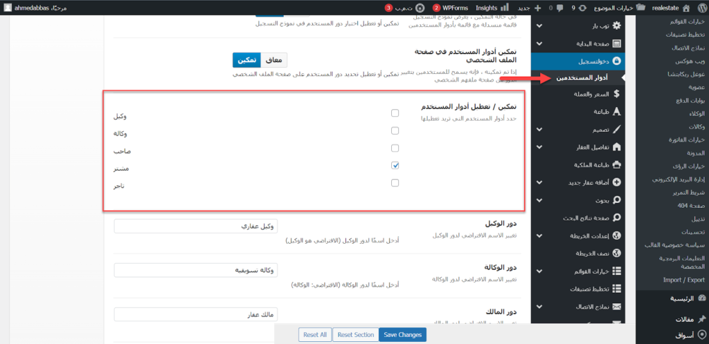 بعد ذلك، انتقل إلى تبويب "أدوار المستخدمين" وقم بتفعيل أدوار المستخدم التي تظهر للعميل أثناء التسجيل. على سبيل المثال وكيل أو وكالة أو تاجر أو غير ذلك.