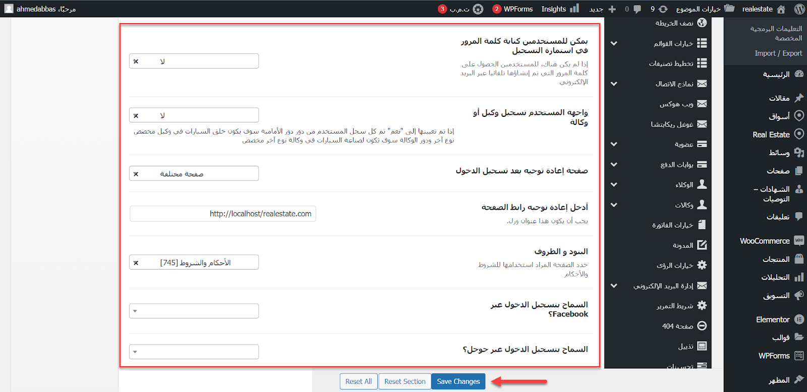 وقم بالنزول إلى أسفل لضبط إعدادات التسجيل، أولاً قم بوضع رابط الصفحة الرئيسية في خيار "إعادة التوجيه"، ثم تحكم في السماح بالتسجيل عبر فيس بوك أو جوجل وصفحة الشروط والأحكام وغير ذلك. بعد الانتهاء، اضغط على "Save Changes".