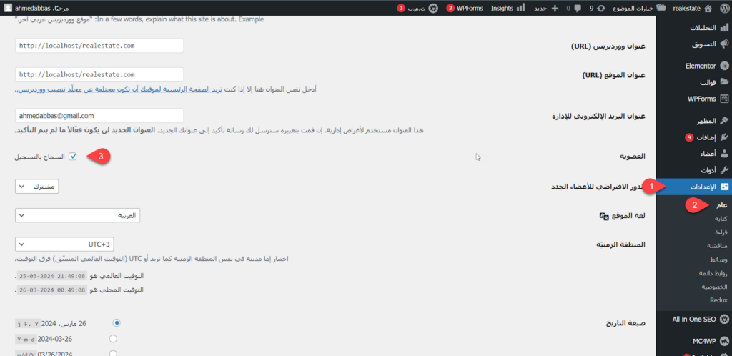 الخطوة التالية، يمكنك تفعيل خاصية التسجيل في الموقع العقاري سواء للوكالات التسويقية أو الوكلاء العقاريين أو العملاء أو غير ذلك. للقيام بذلك، تحتاج إلى تفعيل التسجيل في ووردبريس عن طريق الدخول إلى "الإعدادات" من القائمة الجانبية لووردبريس ثم اختر "عام"، ثم قم بتفعيل خيار "السماح بالتسجيل" ثم احفظ التعديلات.