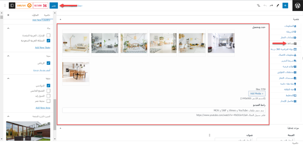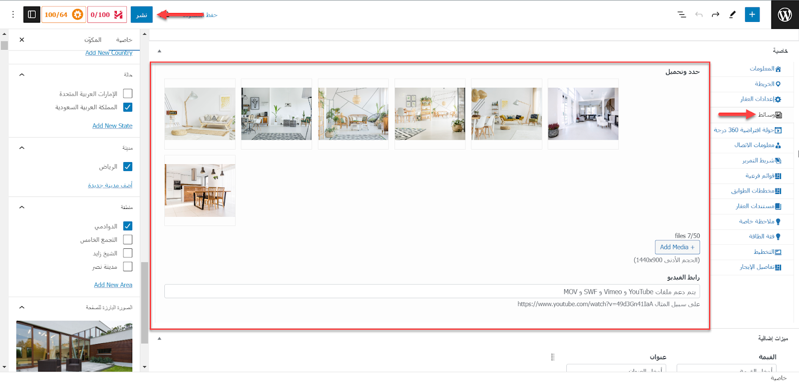 بعد ذلك، انتقل إلى تبويب "الوسائط" وقم برفع جميع ملفات الوسائط المتعلقة بالعقار، مثل الصور والفيديوهات.