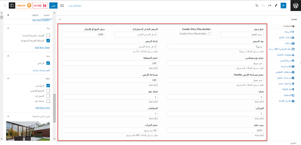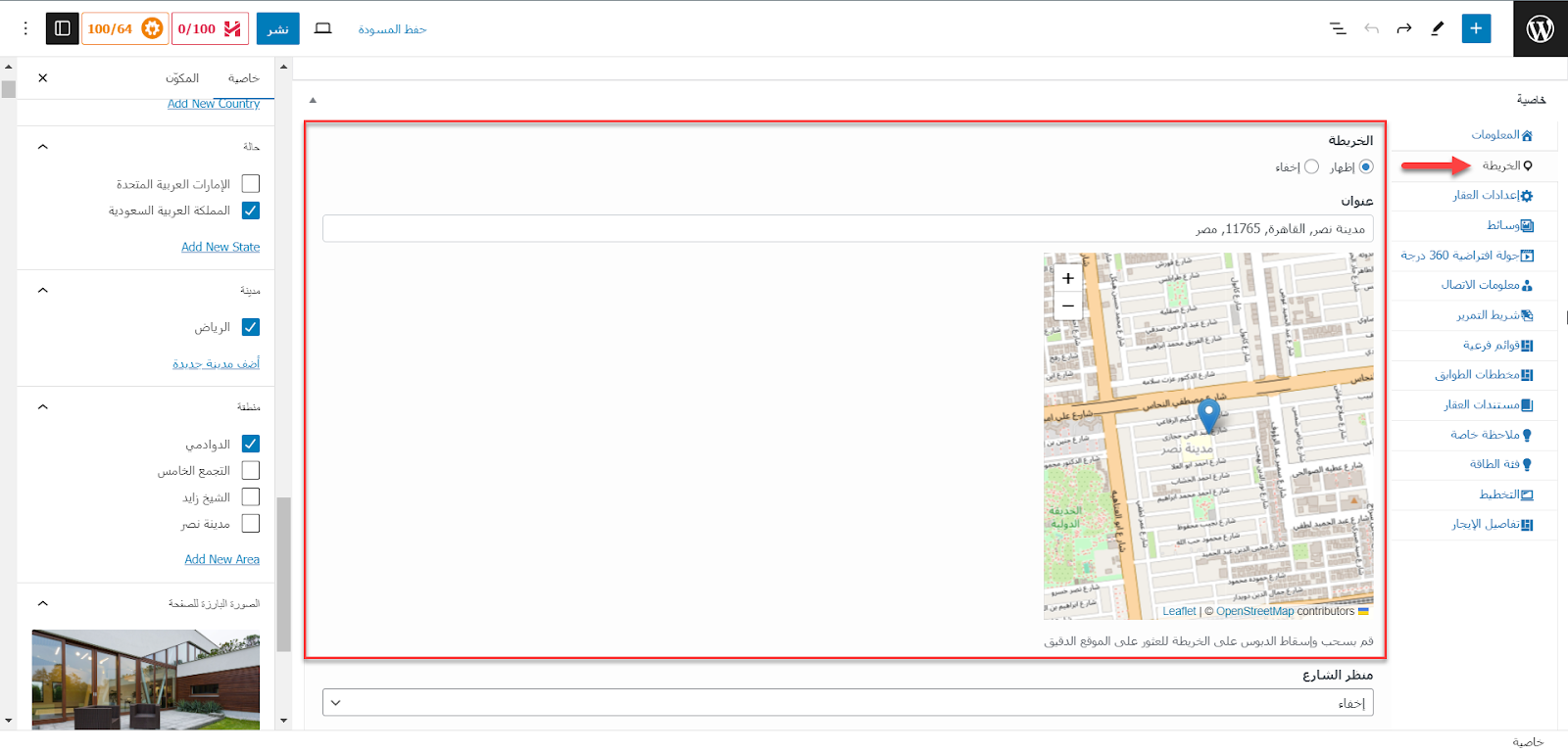بعد ذلك، قم بتحديد موقع العقار من خلال تحديد الدولة والولاية والمنطقة وفقًا لتقسيم الموقع العقاري الخاص بك. ثم، قم بإضافة صورة رئيسية للعقار تظهر في صفحة العقارات الرئيسية كما موضح في الصورة التالية:
