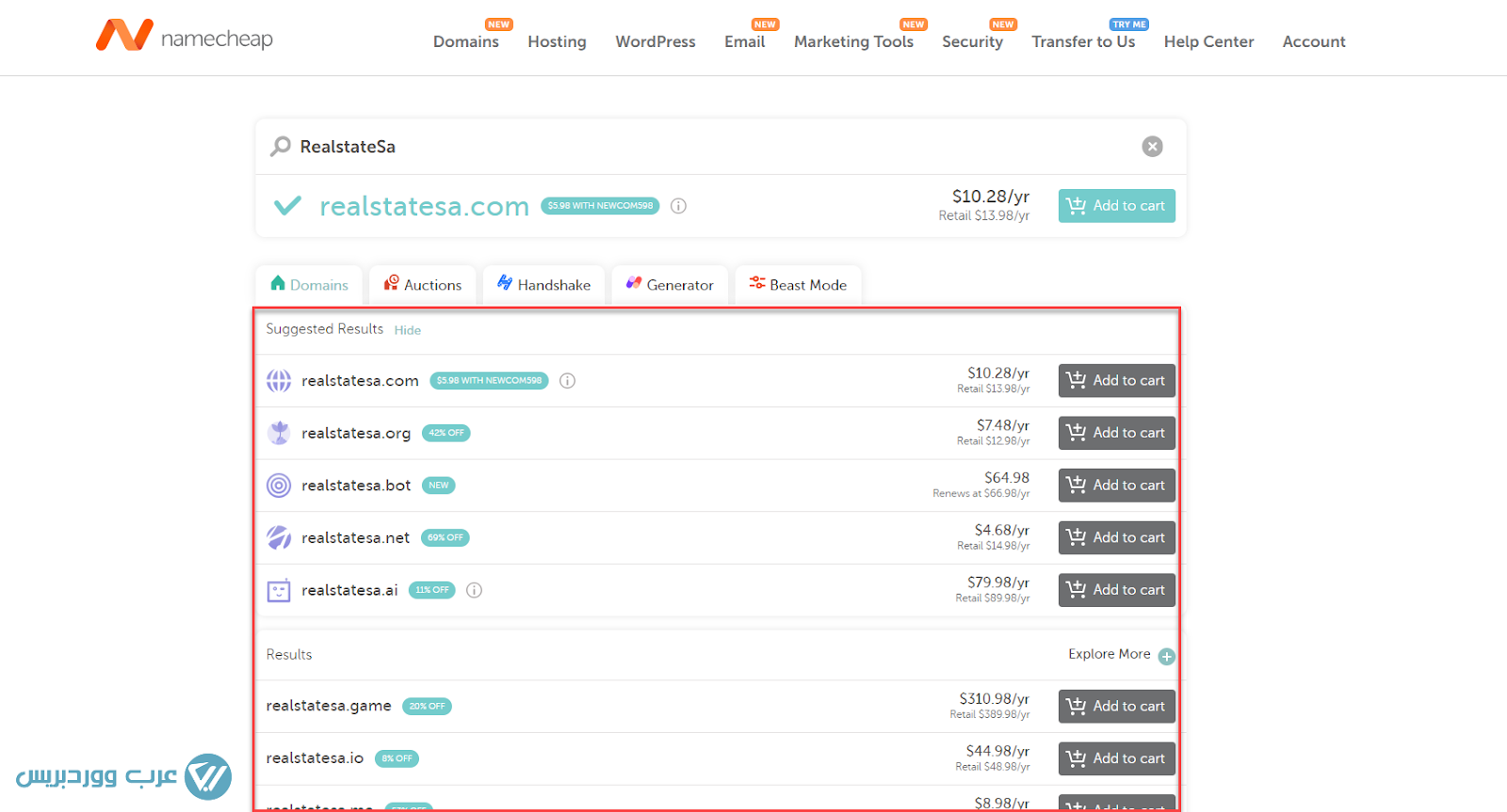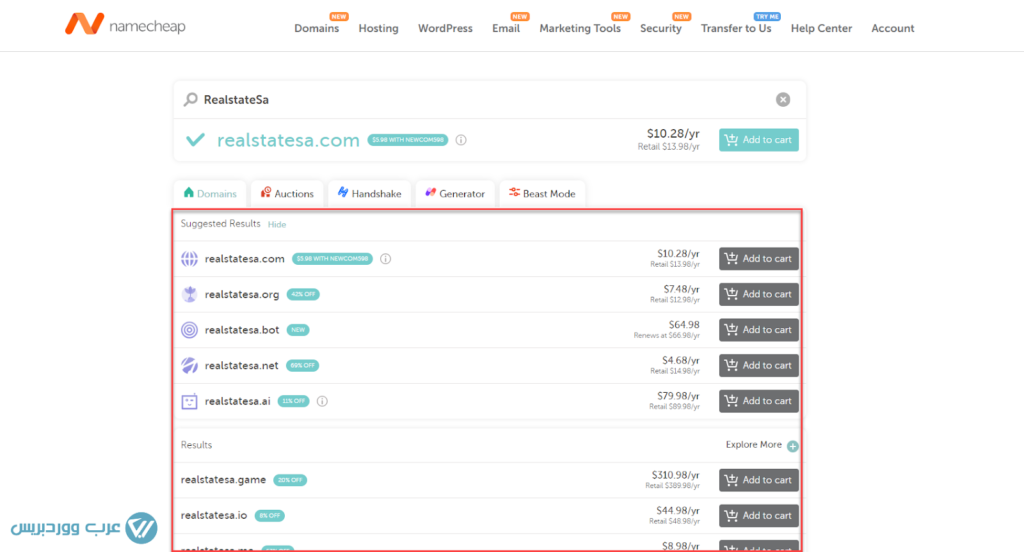 وبالمثل، يُمكنك تحديد خطة الاستضافة المناسبة إذا اعتمدت على شركة استضافة أخرى. بعد ذلك، ستحتاج إلى حجز دومين مخصص للموقع العقاري، ويُمكنك الاعتماد على شركات مثل NameCheap أو GoDaddy. ستجد متوسط تكلفة النطاق في حدود 10 دولار سنويًا، وتختلف تكلفته تبعًا لامتداد الدومين.