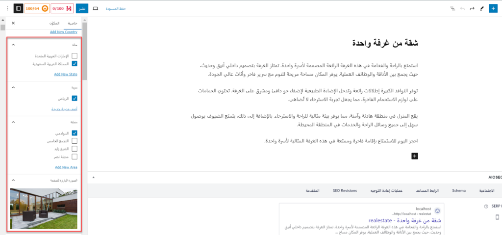 الآن، يجب تنظيم الموقع العقاري عن طريق تقسيمه بناءً على الخدمات المقدمة، سواء كانت عقارات تجارية أو سكنية. ثم تقسيم الموقع بناءًا على الدول المستهدفة، والمحافظات، والمدن، والمناطق، حتى يٌعتمد عليها في البحث وتساعد على تنظيم الموقع للعملاء. بالإضافة إلى ذلك، ينبغي تحديد المميزات الداخلية لكل عقار لمساعدة العملاء في عملية المقارنة.