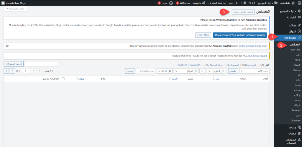 يمكنك الآن البدء في رفع العقارات على الموقع وفقًا للتصنيفات والتقسيم المٌتبع في الخطوات السابقة. للقيام بذلك، اختر "Real Estate" من قائمة ووردبريس ثم اختر "الخصائص"، ومن ثم اختر "أضف خاصية جديدة".