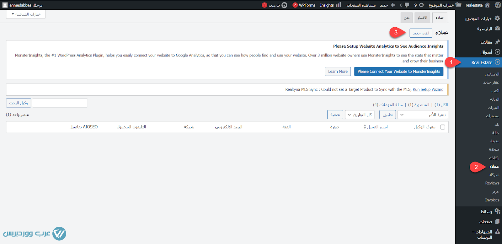 وبالمثل يمكنك إضافة الوكلاء العقاريين على الموقع. وذلك عبر اختيار "عملاء" من "Real Estate" ومن ثم أختر "أضف جديدة".